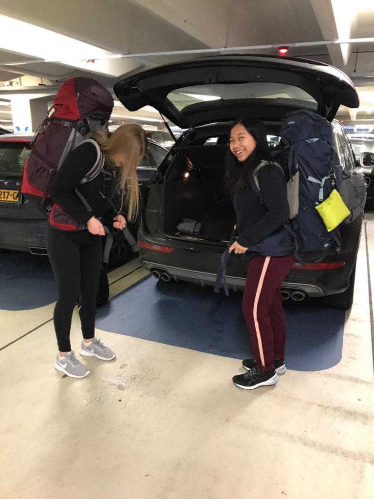 Nachdem nun endlich alle Sachen in unserem Rucksack waren (es war schwerer als gedacht und er ist sehr voll aber sagt mal einem Mädchen sie soll nur das nötigste mitnehmen- das funktioniert einfach nicht) machten wir uns auf den Weg nach Amsterdam zum Flughafen. Plan 1 nach einem kurzen Toilettengang war aufjedenfall den 14 kg schweren Rucksack wegzubringen. Der Check-in verlief super, aber die erste Herausforderung stellte sich uns, als Bitti und ich versucht haben, unsere Rucksäcke in ihre Hülle zu stecken (nachdem sie in ihrer wunderbaren Hülle sind kann man die Rucksäcke leider nicht mehr auf dem Rücken tragen sondern muss sie ziehen-super, dabei kann doch keiner ernst bleiben). Eine Frau zeigte uns mit ihrem Finger die Richtung des Schalters wo wir unseren Rucksack abgeben sollen, aber natürlich haben wir das nicht verstanden, einfach yes thank you gesagt und sind zu dem falschen Schalter gegangen. Die Frau da hat natürlich trotz unseres „perfekten“ englisch das Problem nicht verstanden, bis sie uns endlich zu dem richtigen Schalter schickte. Dannach hat alles super funktioniert- zum Glück.
