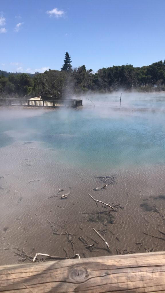 Heute war ein freier „Kiwi Bus“ Tag. Da wir heute nicht um 7 Uhr morgens fertig mit unserem Rucksack am Bus stehen mussten, haben wir erstmal ausgeschlafen. Naja was heißt ausgeschlafen, aber bis 8:45 Uhr ist eigentlich schon ziemlich lange für uns hier in Neuseeland. (Man hätte bestimmt auch länger schalfen können, wäre der eine Typ aus unserem Zimmer nicht 100 mal ans Fenster gegangen und hätte raus geguckt und die Gardine weg gemacht). Nachmittags waren wir dann in einem Park wo ein heißer See mit Schwefel war, aus dem Dampf raus kam. Das sah ziemlich cool aus.