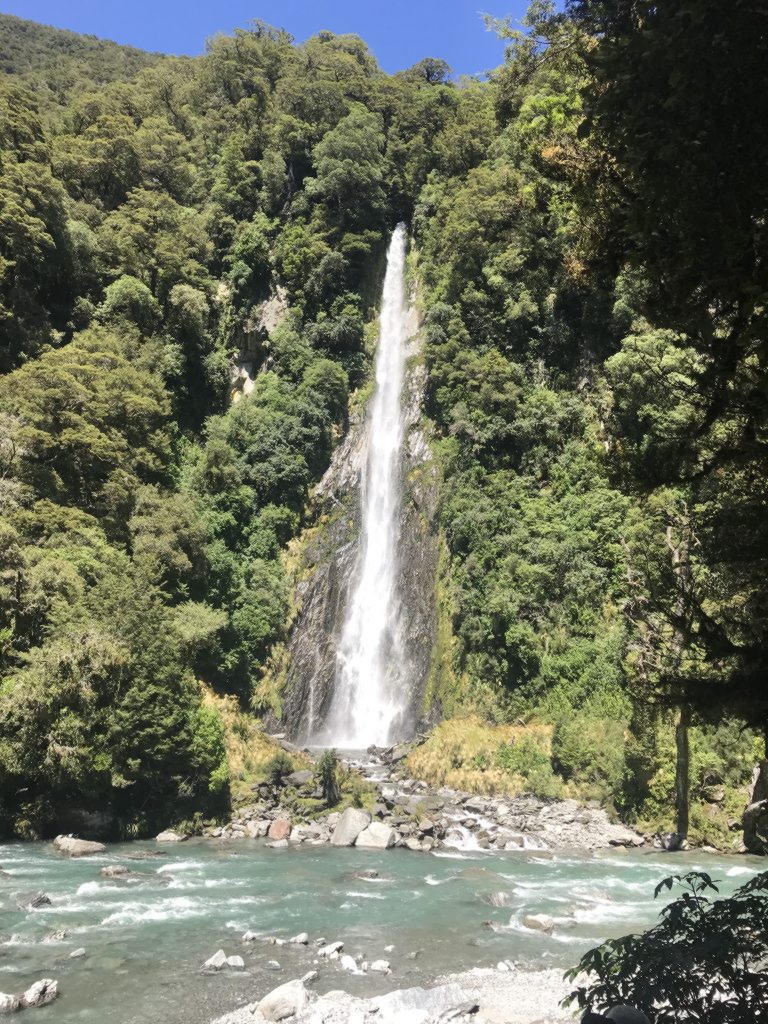 Eine nicht ganz so angenehme Angewohnheit vom Kiwibusfahrer ist es, dass er uns gerne mal morgens früh um 7:30 Uhr abholt, und dann nach nur 30 min Fahrt ein kleiner Stop gemacht wird, um zu irgendeinem Wasserfall oder ähnlichem zu gehen. Prinzipiell eine gute Idee, aber warum muss es denn nur so früh sein? Naja, auch auf der Fahrt nach Wanaka haben wir einen dieser wunderschönen Stops gemacht. Angehalten haben wir bei einem schönen See, in dem sich die Berge extrem klar spiegeln. Das sah wunderschön aus.