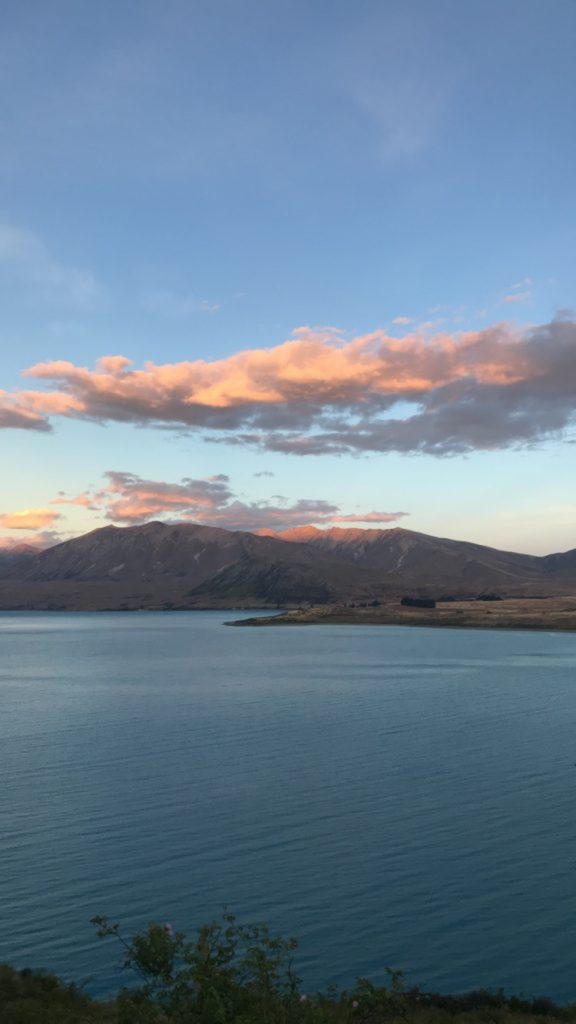 In Lake Tekapo soll angeblich der 2. schönste Sternenhimmel der Welt zu sehen sein, weshalb Touren für 99 Dollar angeboten werden. Den Sternenhimmel wollten wir uns natürlich nicht entgehen lassen, aber da 99 Dollar unserer Meinung nach leicht übertrieben sind, sind wir abends auf eigene Faust auf einen Berg gegangen. Die Aussicht war einfach so wunderschön. Wir haben so gerade noch den Sonnenuntergang mitbekommen.