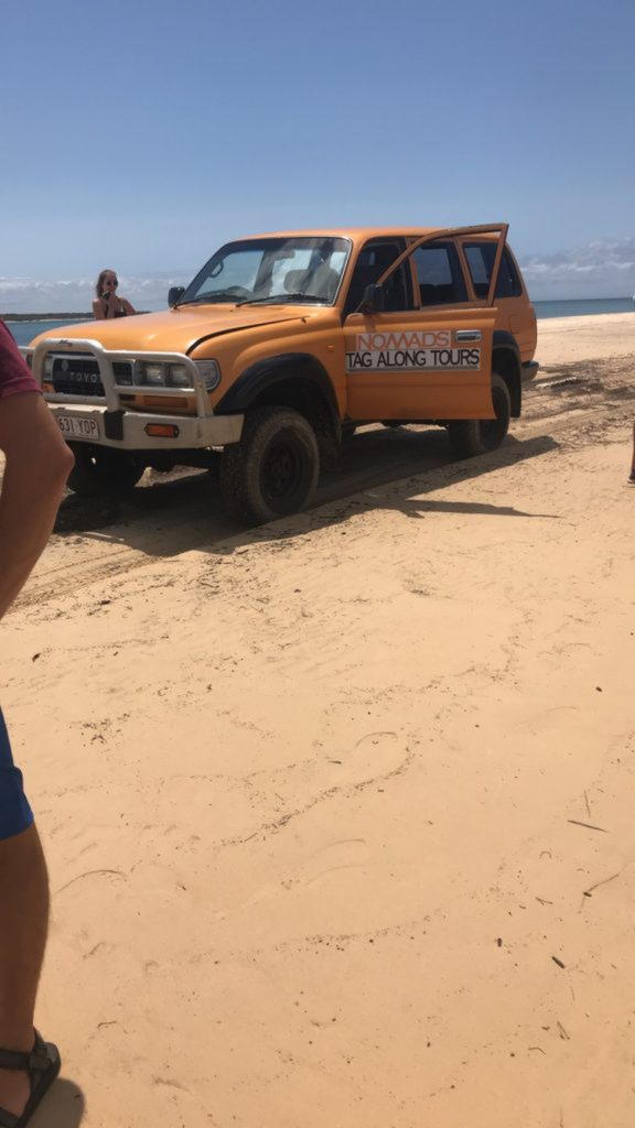 Auf Fraser Island gibt es keine Straßen, was bedeutet, dass man die ganze Zeit durch Sand fährt. Bei unserer Tour war es so, dass wir mit Jeeps über die Insel gefahren sind. So mussten wir uns also in kleine Gruppen aufteilen und einem Jeep zuordnen. Schnell war klar, dass wir zusammen mit 2 Mädchen aus Sylt in ein Jeep wollen, aber da wir alle noch nicht 21 sind, mussten wir uns schnell noch 4 Leute suchen, die mindestens 21 waren. Hat dann auch alles geklappt und so landeten Bitti und ich in Car 3. Jetzt fragt ihr euch bestimmt warum schreibt sie Car 3, aber ich sag euch die Reihenfolge der 4 Autos ist sehr wichtig und musste aufjedenfall eingehalten werden.