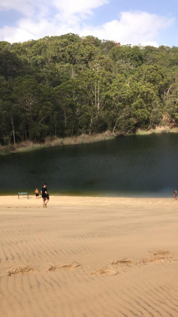 Auf Fraser Island sind wir zu mehreren Seen gefahren, waren bei den Champagne Pools (kleine Zwischengeschichte: Das Wetter war sehr stürmisch, sodass die Wellen sehr hoch waren. Auf unserem Weg zu den Champagne Pools sind wir 2 Rangern begegnet, die uns davon abgeraten haben dort hin zu fahren, weil es zu gefährlich ist und falls doch, wir auf keinen Fall schwimmen gehen sollen. Jim hat natürlich gesagt, dass wir das auf keinen Fall machen. Nun ja, er war der erste, der in den Champagne Pools war und kurz dannach auch wir anderen, aber es ist zum Glück nichts passiert.) und bei den Indien Heads, wo man eine tolle Aussicht hatte. Das Wetter war leider nicht so mega gut. Am letzen Tag war es sogar richtig stürmisch, sodass die Flut so hoch war, dass wir kaum mehr mit den Autos am Strand entlang fahren konnten. Wenn die Autos mit Salzwasser in Berührung kommen, können diese kaputt gehen. Jim hat das jedoch nicht gejuckt und wir sind trotzdem los gezogen. Als einmal so eine hohe Welle kam, dass Auto 2 komplett im Wasser war, ging dieses nicht mehr an, doch glücklicherweise hat Jim das wieder hinbekommen. Auch unser Auto stand mal komplett Unterwasser aber ihm ist nichts passiert. Auf dem Rückweg mussten wir 2 Stunden warten, weil dort, wo unser Weg war nur Wasser war. Zum Glück sind wir alle gesund wieder zurückgekommen. Neben dem einem Auto was nicht mehr anging, musste auch ein anderes Auto abgeschleppt werden mit einem Seil.