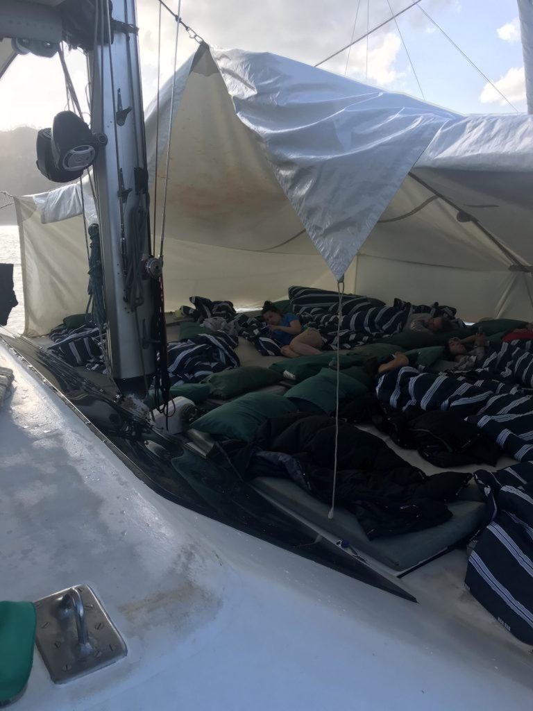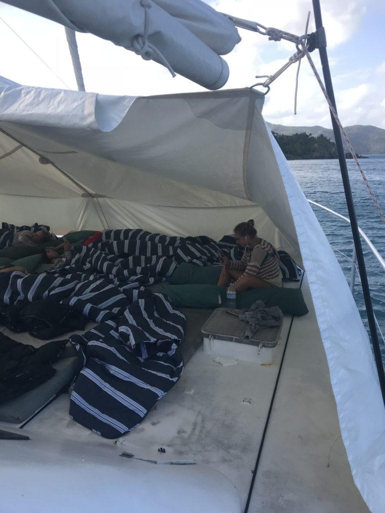 Gegen Mittag sind wir los gefahren und waren den restlichen Tag auf dem Schiff. Das war richtig entspannend. Wir haben uns gesonnt und auf dem Boot lief die ganze Zeit Musik. Als wir am Aben endlich geankert haben gab es Abendessen. Generell war das Essen auf dem Schiff richtig gut. Es gab frisch gegrillten Fisch, Salat, Kartoffelpüree und Brot. Das Schiff war nicht so groß und wir haben uns die ganze Zeit gefragt wo wir denn schlafen falls es regenen sollte, denn es gab drinnen nur 8 Betten und darauf standen all unsere Taschen. Nach dem Essen wurde dann zum Glück ein großes Zelt aufgebaut, sodass wir alle draußen schlafen und die Sterne beobachten konnten. Es war sogar relativ gemütlich und wir konnten alle ganz gut schlafen.